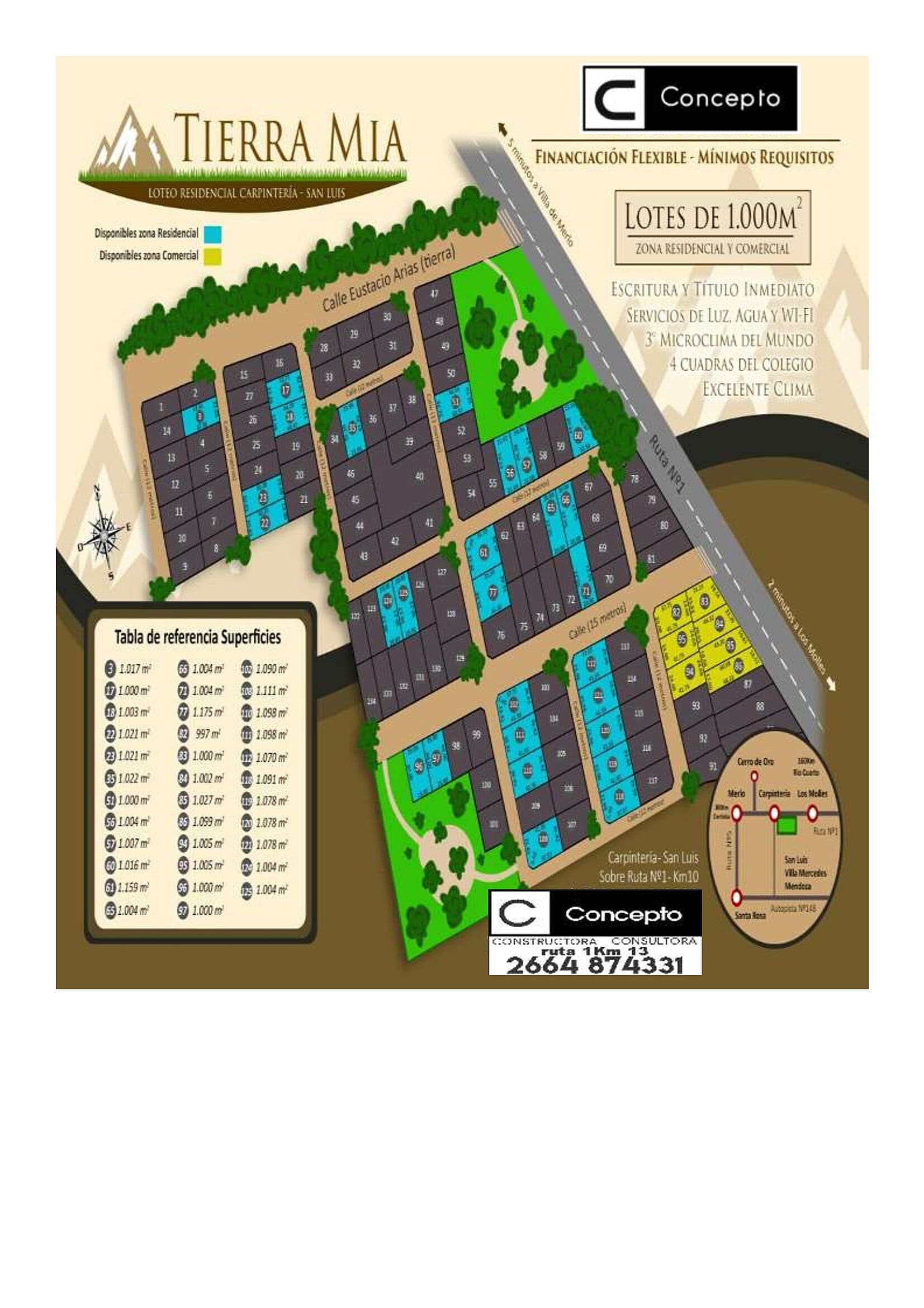 El loteo se ubica en Carpinteria, Ruta 1 Km 10. Lotes de 1000m2, se encuentran de 100 a 250 mt de la Ruta. Facil y rapido acceso al pueblo. Parcelas llanas, sin piedras. A tan solo 5 minutos de Merlo. Servicios de Luz y agua y wi fi. Escrituracion inmediata. Excelentes vistas a las sierras